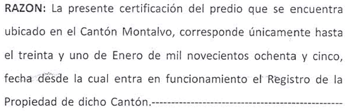 Como vemos, la Registradora de la Propiedad de Babahoyo RECONOCE que las haciendas El Tejano y Río Playón SE ENCUENTRAN UBICADAS EN EL CANTÓN MONTALVO, y por si fuera poco, reconoce también que éste entró en funcionamiento el 31 de enero de 1985.